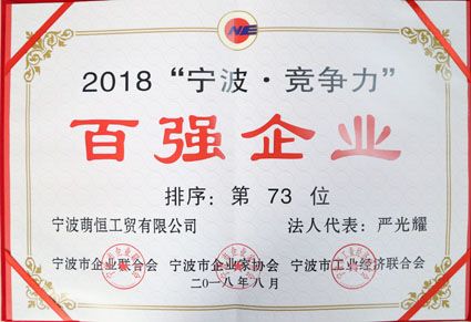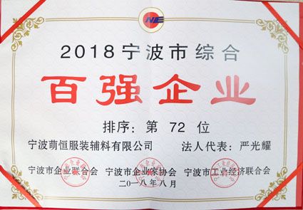榜單是根據2017年銷售(營業)收入大小為序進行排名的。萌恒服裝輔料以369391萬元的營業收入位居2018寧波市綜合百強企業第72位,較去年排名提升14位;位居制造業百強企業第38位,較去年排名提升8位。萌恒工貿位居寧波·競爭力百強企業排名第73位。