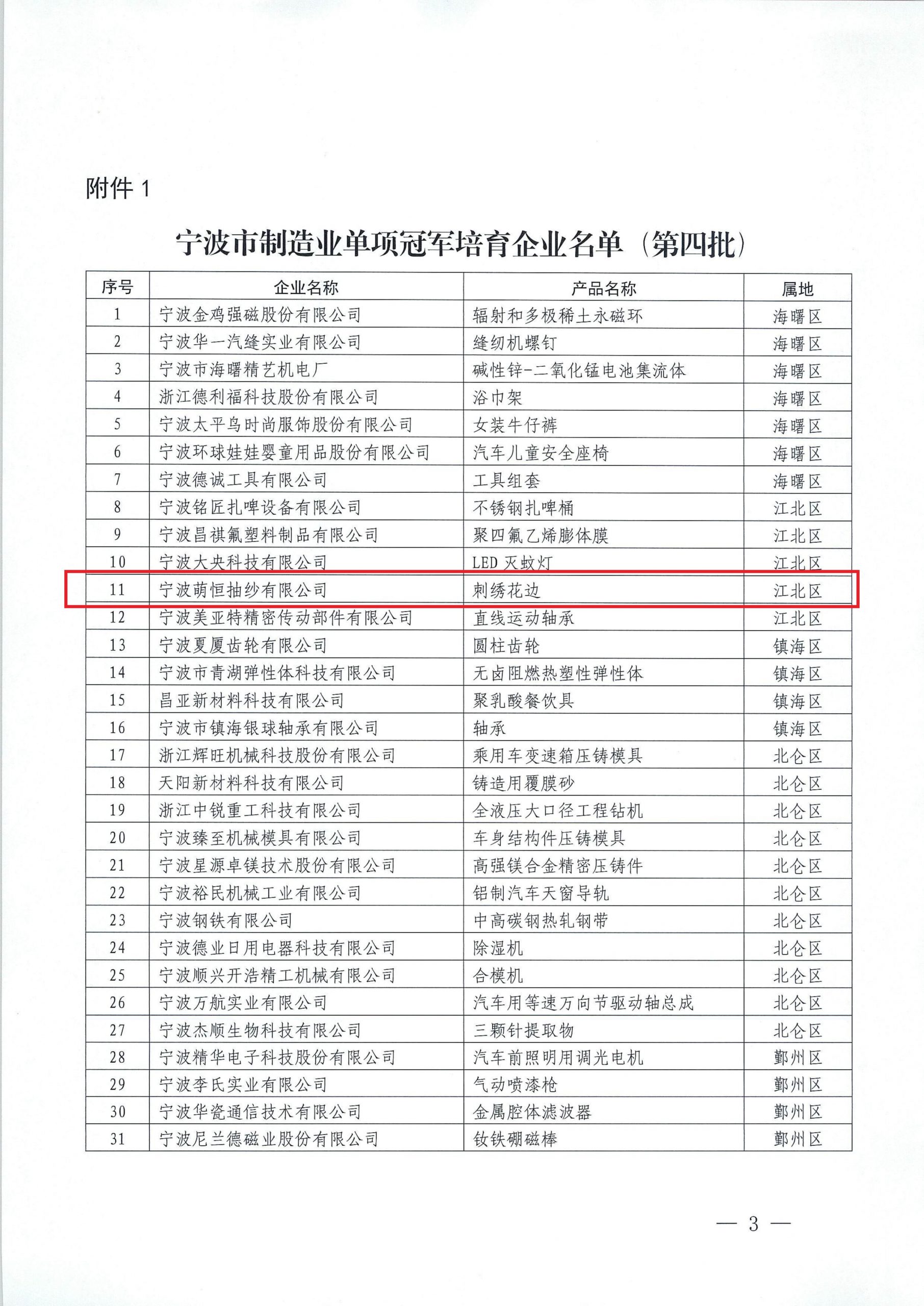 近日,寧波市經(jīng)濟(jì)和信息化局公布了寧波市第四批制造業(yè)單項(xiàng)冠軍企業(yè)名單,萌恒抽紗的刺繡花邊榮幸登榜!
