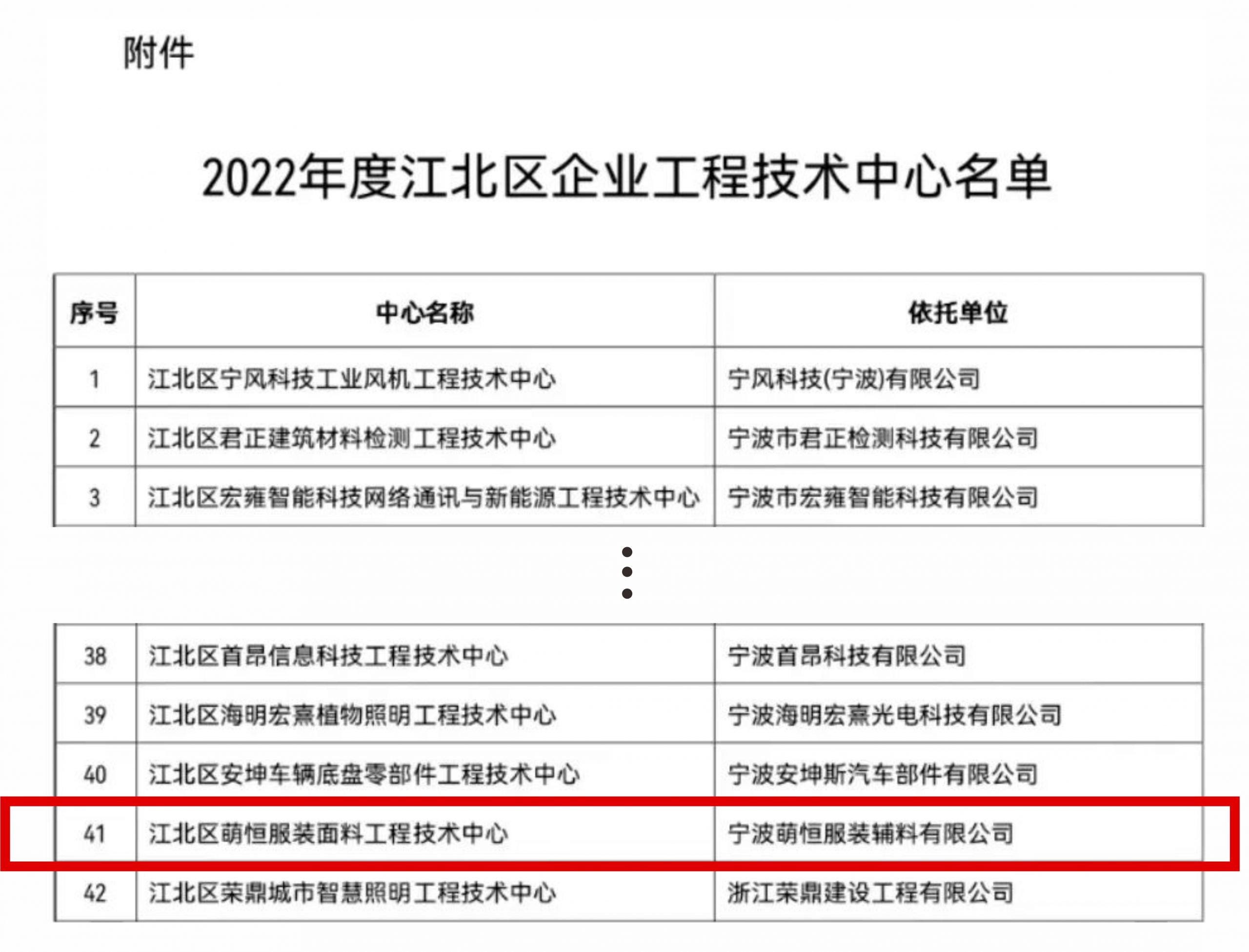 萌恒服裝面料工程技術(shù)中心獲評江北區(qū)企業(yè)工程技術(shù)中心
