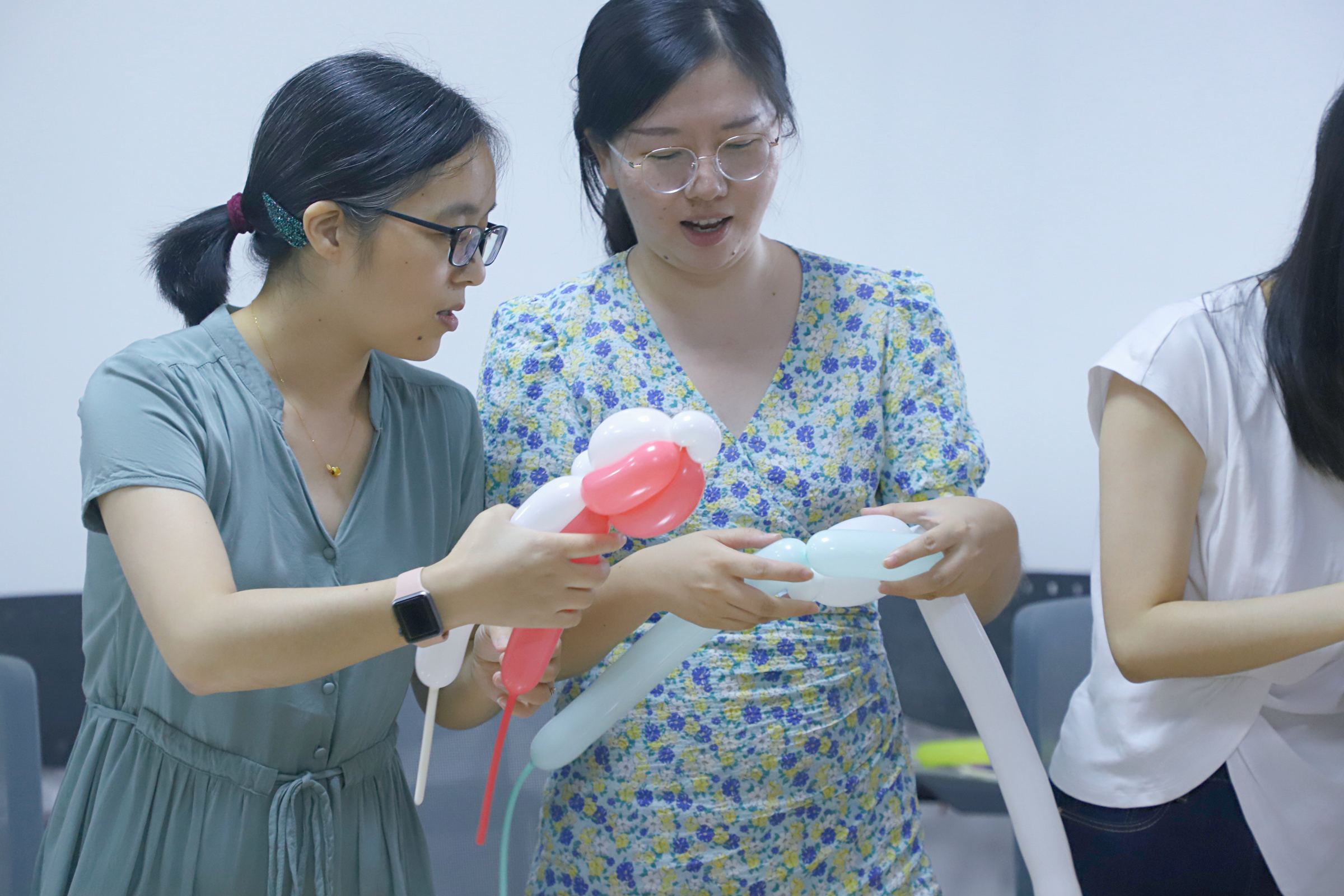 五彩的氣球構(gòu)建了最美的夢,受邀的專業(yè)老師向大家分享了如何打氣球、綁氣球的知識點,講解氣球造型的基本技巧,幫助大家把握氣球旋轉(zhuǎn)的方向和力度,在老師的幫助和指點下,大家很快投入到了動手制作中,從一開始的生疏、害怕氣球爆炸到慢慢掌握了基礎(chǔ)手法,粘膠、拼貼、配色加上自己的一些奇思妙想,雖不時有氣球“嘭嘭”爆破的聲音,但大家熱情高漲,時間不知不覺過去,一件件作品也逐漸呈現(xiàn)在眼前,看似相同卻也不盡相同。