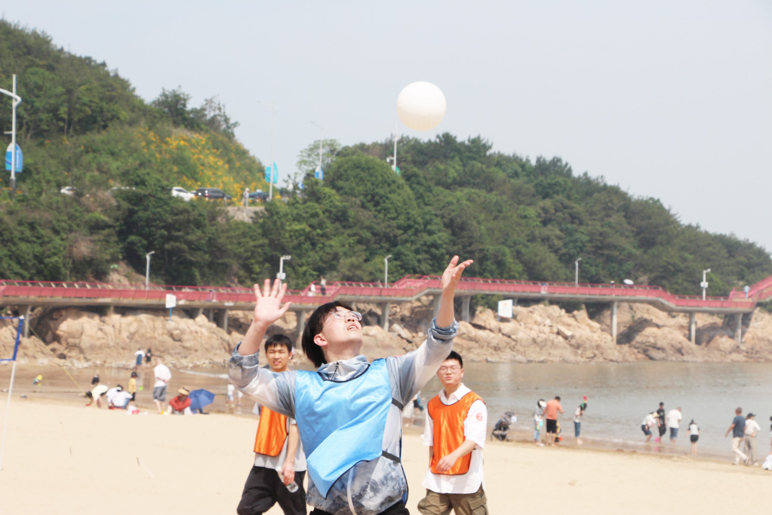 清涼的海風、跳躍的動作、揮灑的汗水、緊張的賽程,一場激烈的沙灘排球和兩人三足正在上演著,球場上的隊員在陽光下盡情跳躍、墊球、扣球;沙灘上的伙伴搭著肩、攬著腰,奮力奔跑,小小的繃帶,緊靠的臂膀,見證著心與心的團結?,F場充滿了加油吶喊聲,大家勠力同心、放松心情,共同收獲幸福喜悅。