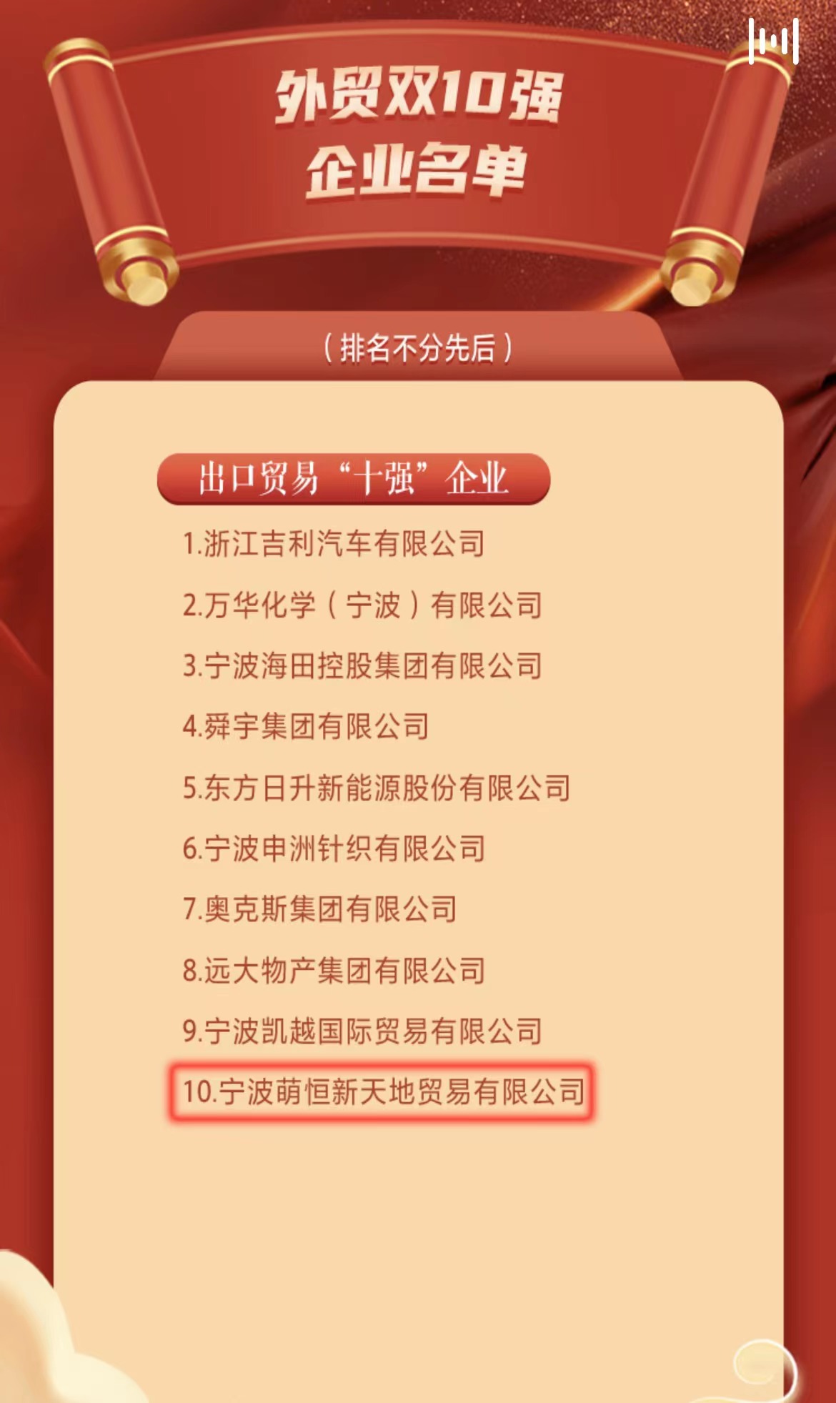2022寧波創新創業風云榜揭榜|萌恒榮獲出口貿易“十強”企業