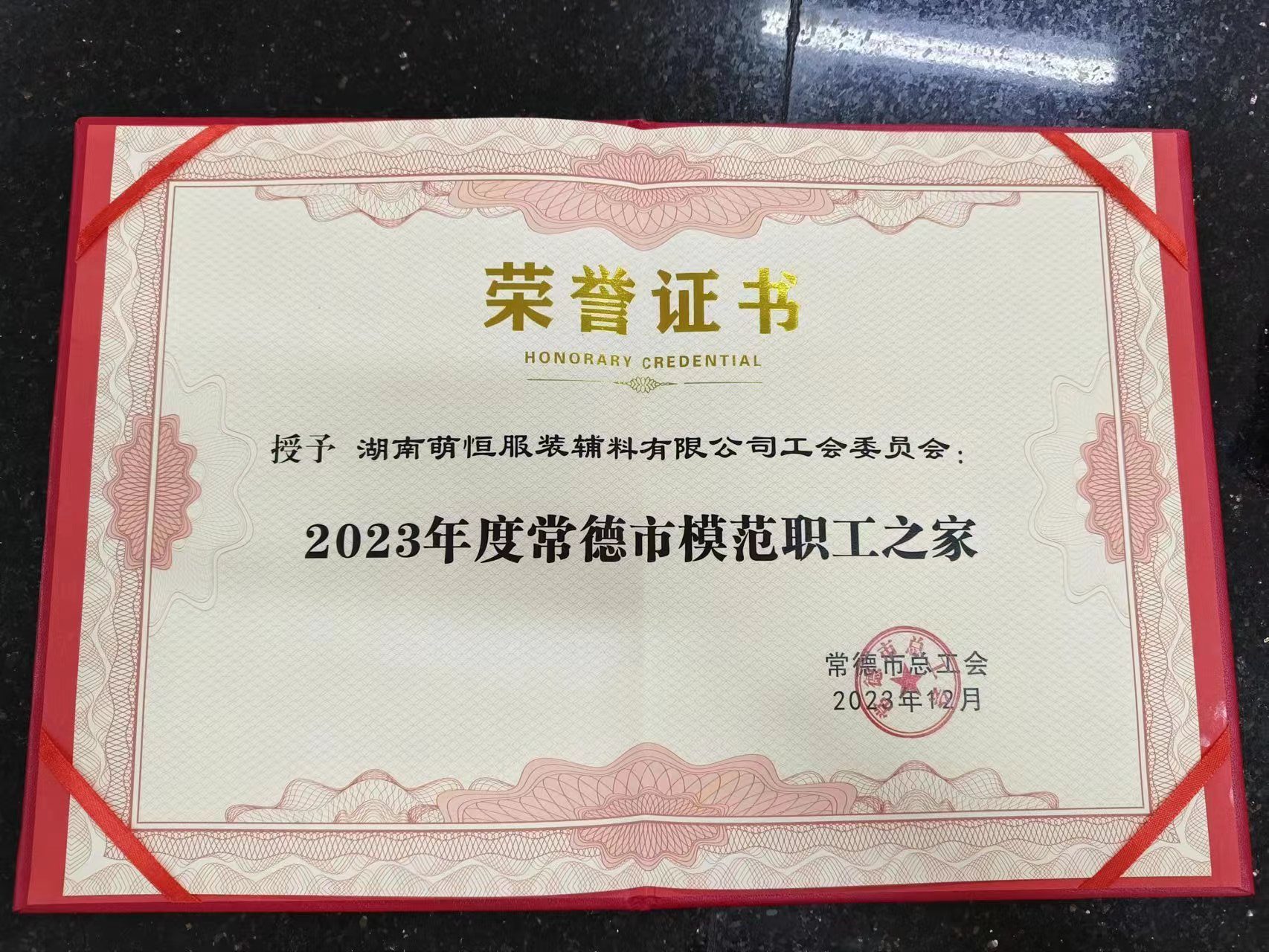 近日,經過為期五天的公示,湖南萌恒服裝輔料有限公司工會委員會成功獲評“2023年度常德市模范職工之家”榮譽稱號。