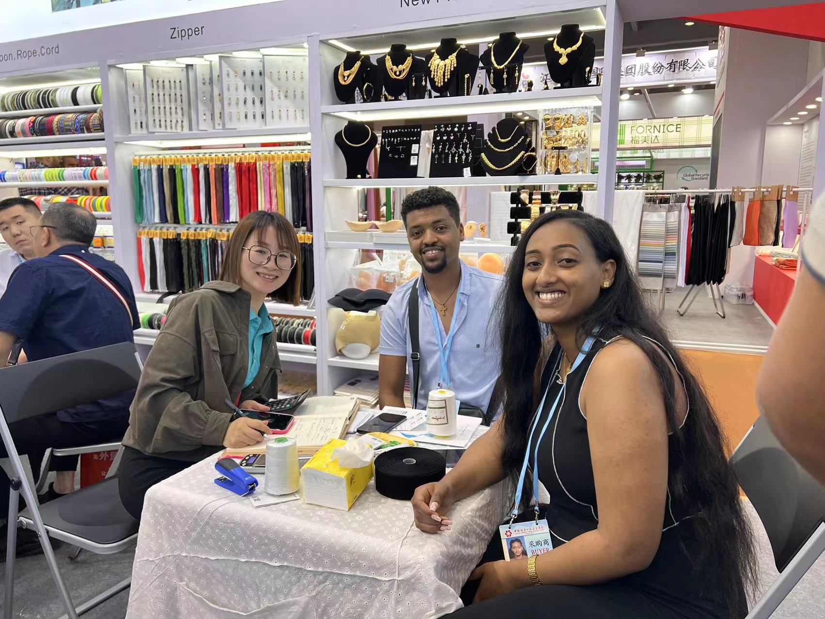 展會期間,我們共接待了世界各國的客商945名,客戶群體更豐富,客戶數明顯高于上屆廣交會。產品方面,二期家居攤位的展示盒類、環保產品,禮品攤位的特殊帶類獲得了客戶的青睞;三期紡織面輔料攤位琳瑯滿目的面輔料全品類吸引了新老客戶眼球,客戶絡繹不絕,人聲鼎沸。業務員耐心引導,并為客戶講解各類產品。他們專業的素養和熱情的服務,讓客戶感受到了用心,也贏得了客戶信任和好評。