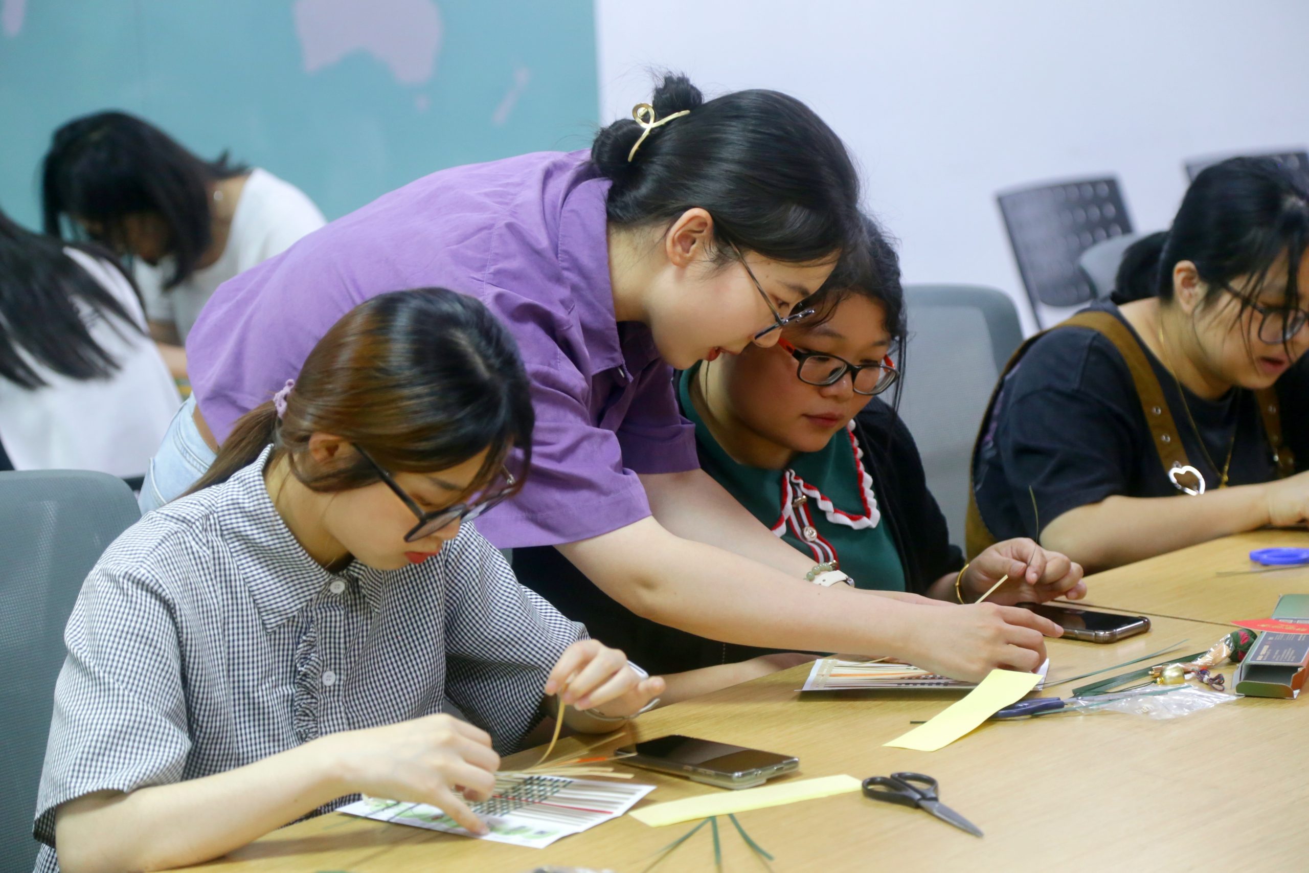 6月7日中午,當小伙伴們來到活動場地時,材料制作包早已整整齊齊地擺放在座位上。隨著全員有序落座,活動正式開始。在老師的耐心講解和視頻輔助下,大家專注而細致地開始穿竹引線,細長的蔑片在每個人的指尖上交互翻動。當制作遇到瓶頸時,有人向老師請教,有人和同伴探討,現場一片和樂的氛圍,超級有愛!