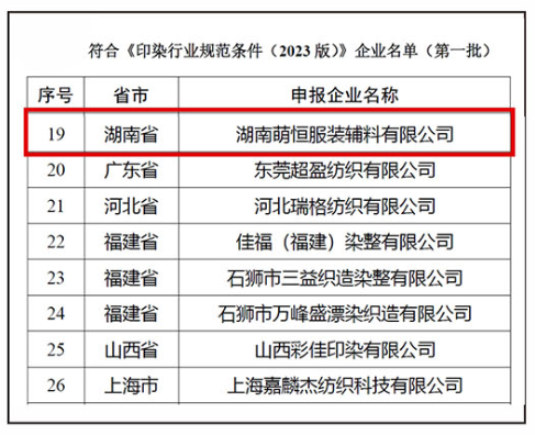為推動印染行業(yè)結(jié)構(gòu)調(diào)整和轉(zhuǎn)型升級,引導(dǎo)行業(yè)高端化智能化綠色化發(fā)展,根據(jù)《印染行業(yè)規(guī)范公告管理辦法》有關(guān)規(guī)定,工信部今年組織開展了印染企業(yè)規(guī)范公告申報和復(fù)核工作。經(jīng)企業(yè)自主申報、省級工業(yè)和信息化主管部門核實推薦、專家組評審、征求生態(tài)環(huán)境部意見等程序,9月12日,公示通過了第一批符合《印染行業(yè)規(guī)范條件(2023版)》企業(yè)名單。其中,湖南有三家企業(yè)入圍,萌恒榜上有名!