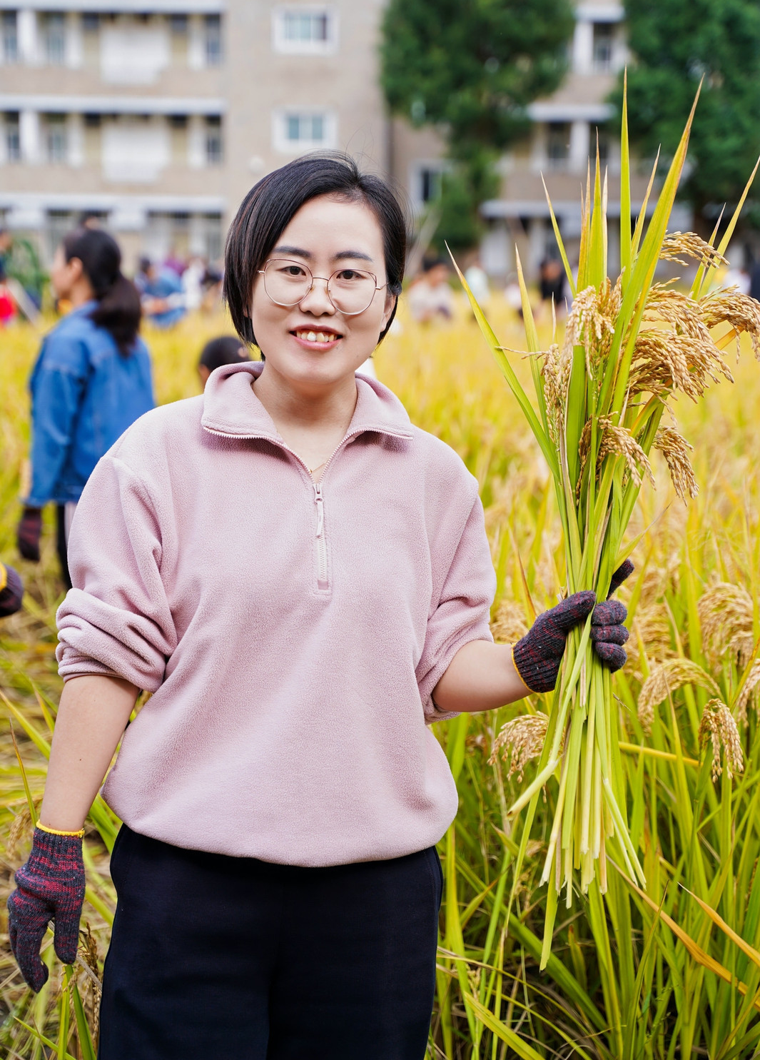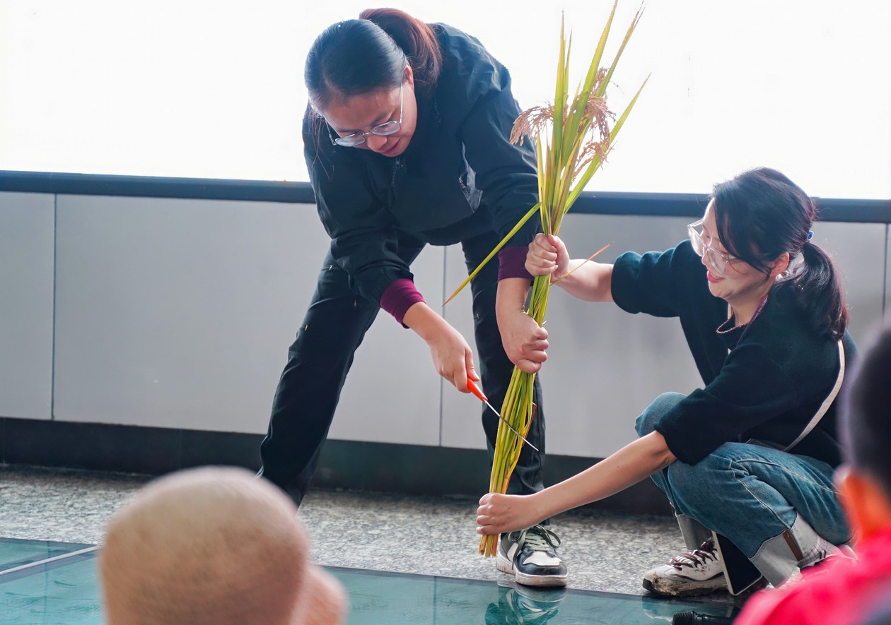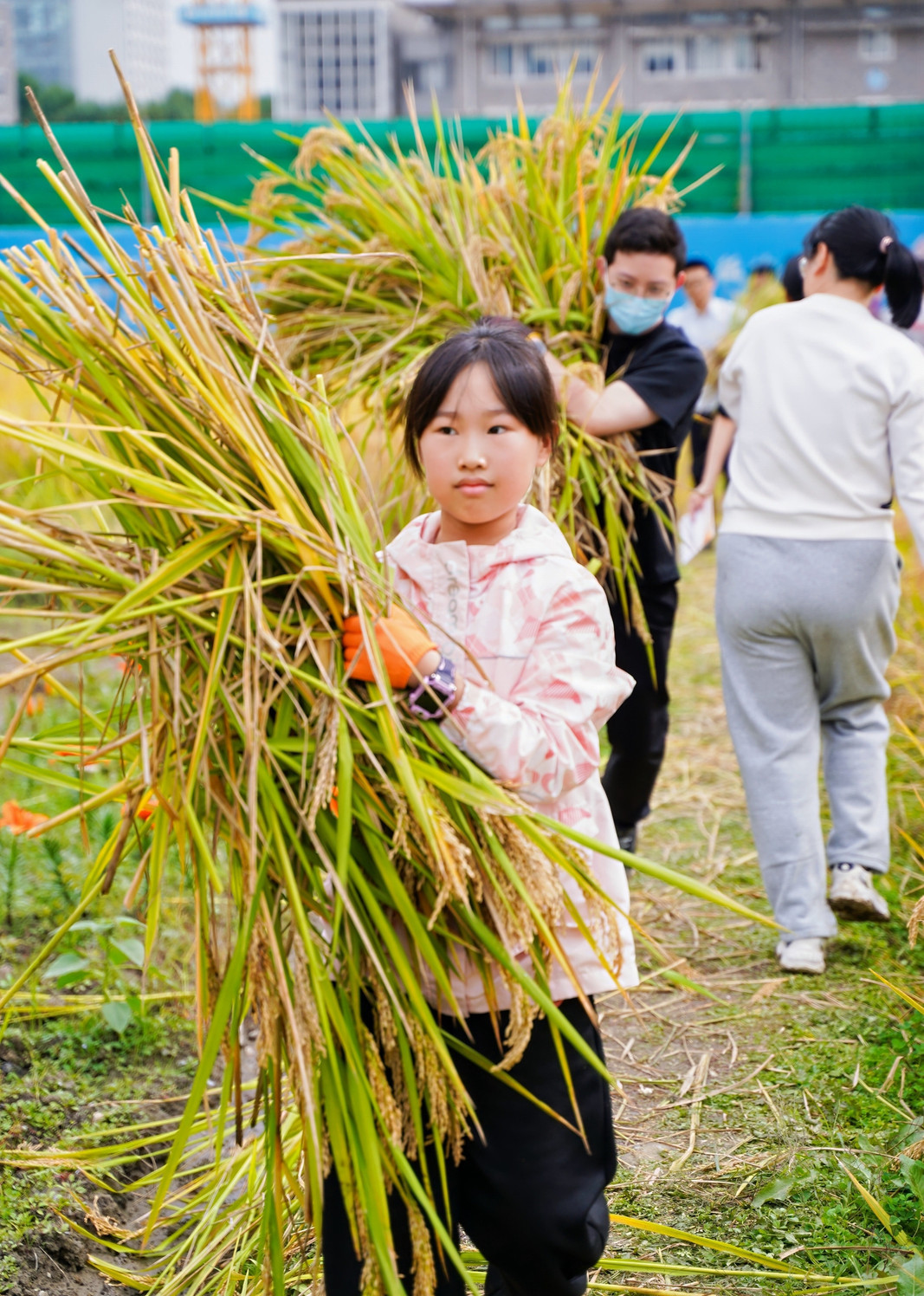 最后登場的是激動人心的水稻收割環(huán)節(jié),家長與孩子們攜手踏入金黃的水稻田,瞬間化身為勤勞的農(nóng)夫。稻田里,有的家庭分工明確,家長負(fù)責(zé)收割,孩子們則負(fù)責(zé)搬運,配合默契十足;有的家庭則全家齊上陣,共同體驗收割的樂趣。孩子們初次體驗水稻收割,臉上洋溢著好奇與興奮的笑容,盡管動作略顯生疏,但那份認(rèn)真的態(tài)度讓人動容。收割完成后,大家又一同進行脫穗、裝袋、稱重,每一個步驟都充滿了歡聲笑語,整個稻田都沉浸在一片歡樂的海洋之中。