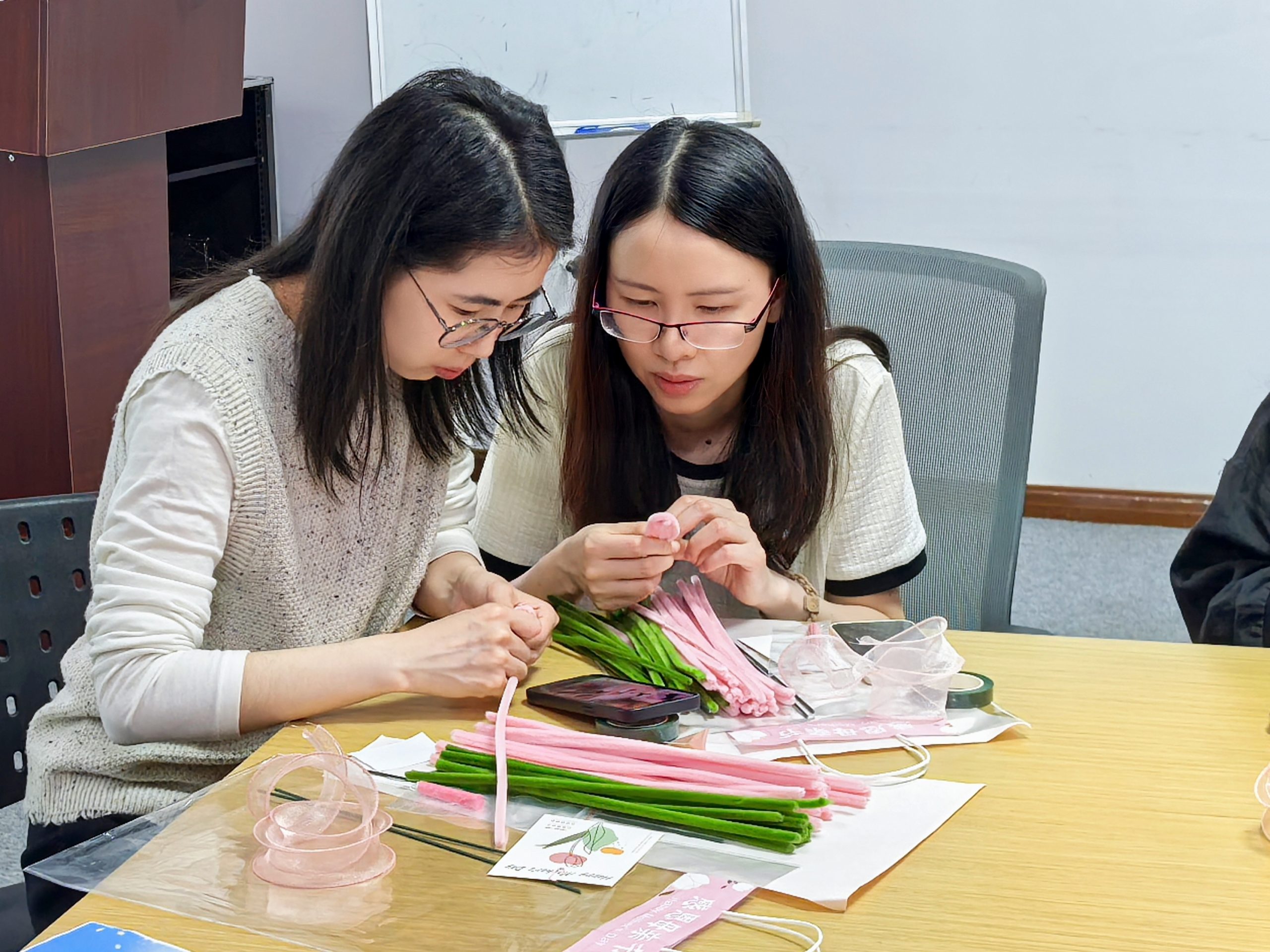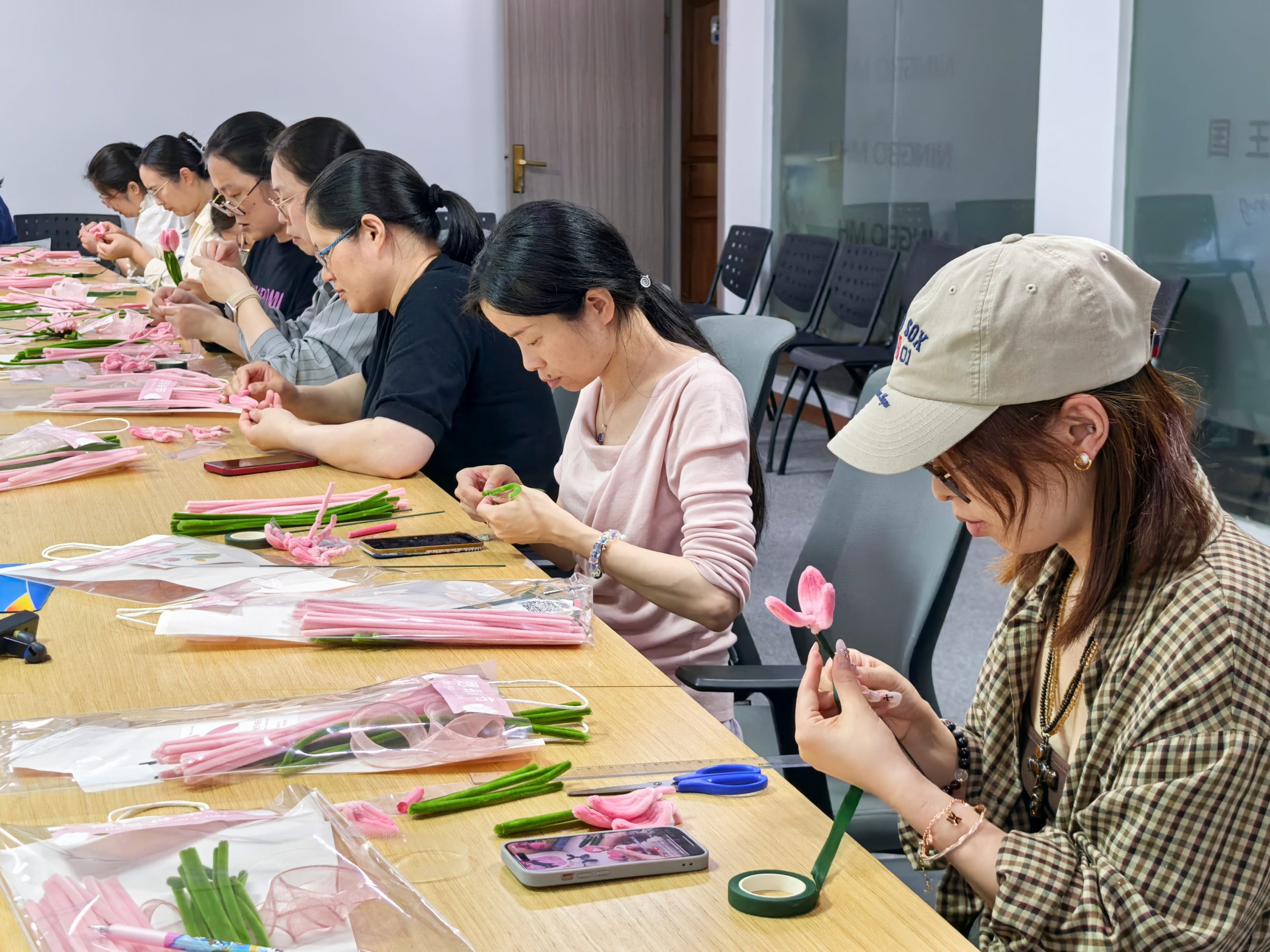 經(jīng)過一個(gè)小時(shí)的努力,一朵朵粉嫩的郁金香在指尖逐漸綻放。耐心制作、細(xì)心包扎,精美的花束承載著我們對(duì)母親的深情。那一刻,我們不僅是職場(chǎng)人,更是一群想要把愛意傳遞給母親的孩子。或許我們不善言辭,但指尖的溫度會(huì)替我們?cè)V說——那些藏在心底的感謝,那些未能常伴左右的歉意,還有那份永遠(yuǎn)不變的牽掛。
