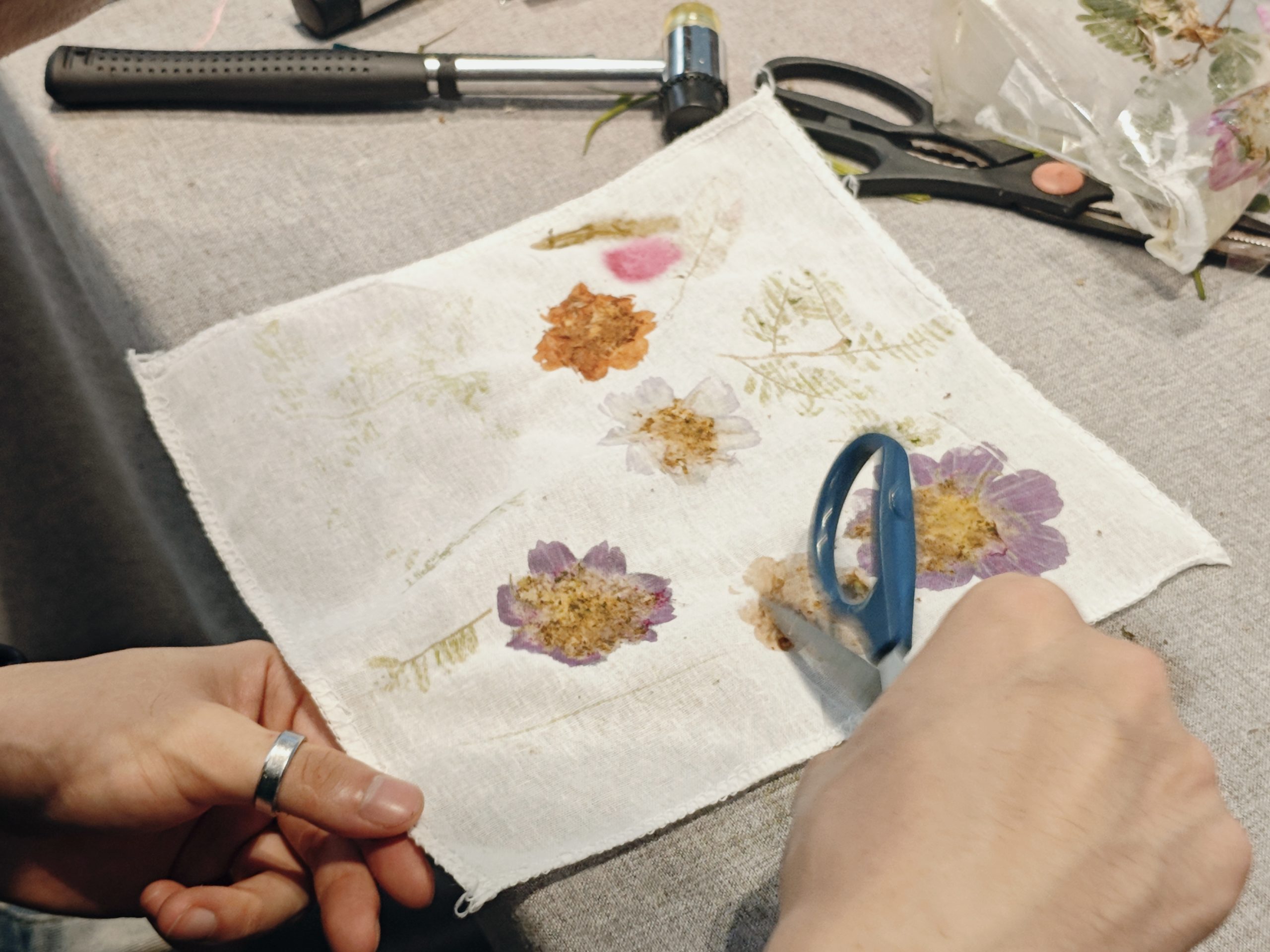 在專業老師指導下,一場充滿自然氣息的“植物拓染”體驗展開。花瓣與葉片的天然汁液被輕輕敲打、拓印在素凈的棉布上,留下獨一無二的紋理與色彩,將山野的饋贈與此刻的美好時光一同封存。