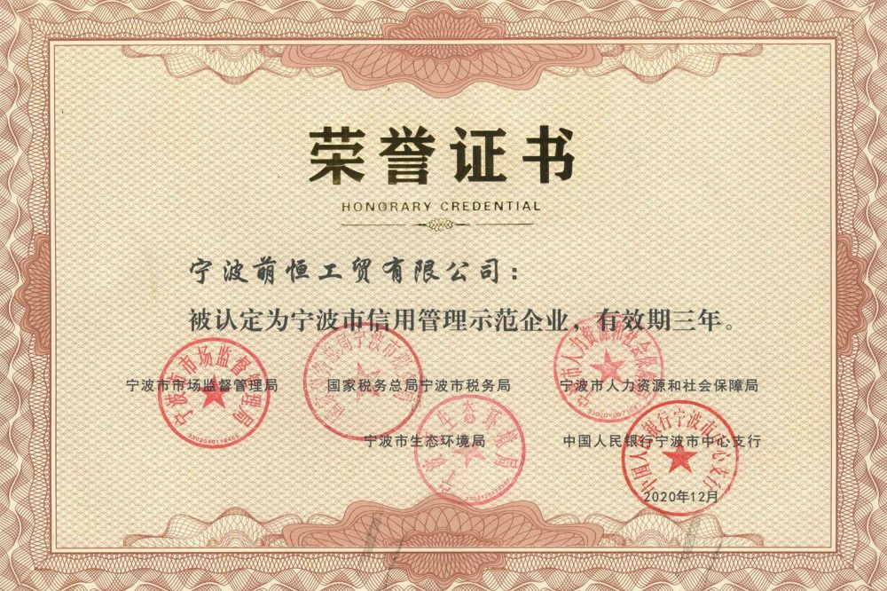 2021年5月5日強化企業誠信意識 加強企業信用建設 萌恒獲評“寧波市信用管理示范企業”